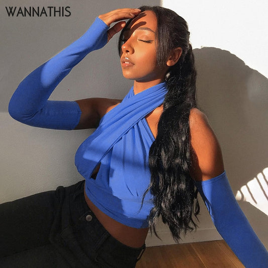 WannaThis Crop Top Women Halter Camis Sexy Irregular Criss Cross With Sleeve Backless Solid Blue Women Hollow Out Slim Stretchy